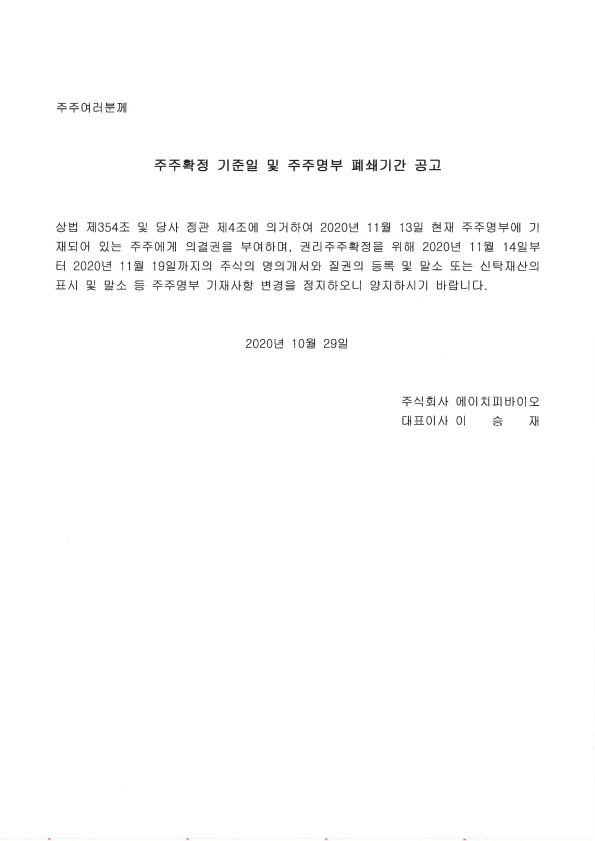 주주확정 기준일 및 주주명부 폐쇄기간 공고 Page Info 작성자 최고관리자 Hit 6,526 Hits Date 20-10-29 19:46 댓글 0 Comments Copy Post 내용 주주확정 기준일 및 주주명부 폐쇄기간 공고