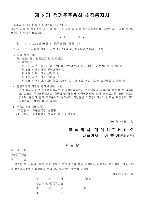 제5기 정기주주총회 소집통지서