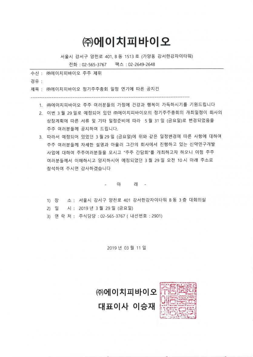 (주)에이치피바이오 정기주주총회 일정 연기에 따른 공지… 페이지정보 글쓴이 최고관리자 조회 5,912 조회 날짜 19-03-11 18:49 댓글 0댓글 글 복사 내용 (주)에이치피바이오 정기주주총회 일정 연기에 따른 공지건 목록 답변 이전 다음 댓글목록 댓글목록 댓글이 없습니다
