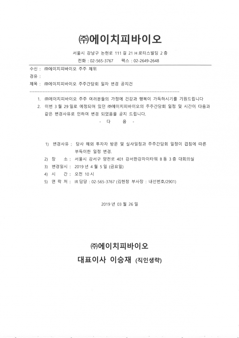 (주)에이치피바이오 주주간담회 일자 변경 공지건 Page Info 작성자 최고관리자 Hit 6,125 Hits Date 19-03-26 14:04 댓글 0 Comments Copy Post 내용 (주)에이치피바이오 주주간담회 일자 변경 공지건