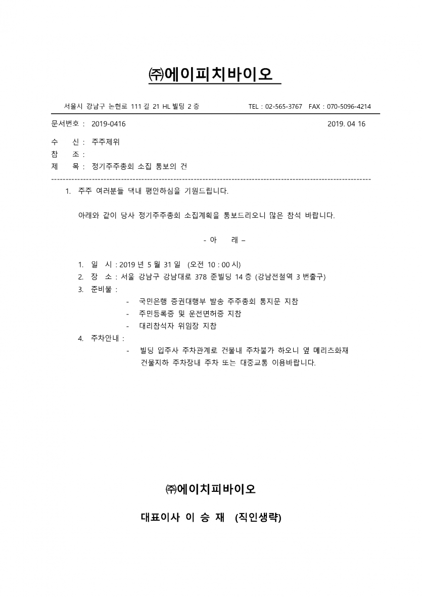 (주)에이치피바이오 정기주주총회 일정 공지건 Page Info 작성자 최고관리자 Hit 6,046 Hits Date 19-04-17 11:26 댓글 0 Comments Copy Post 내용 (주)에이치피바이오 정기주주총회 일정 공지건