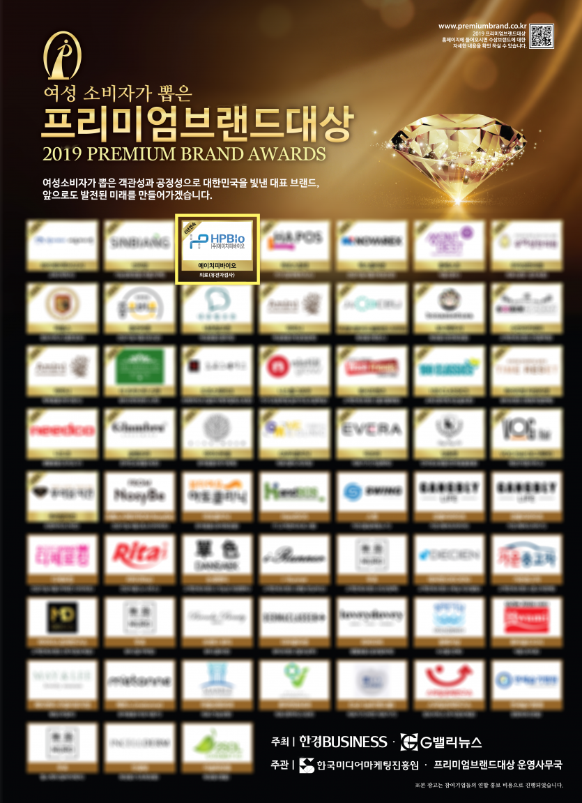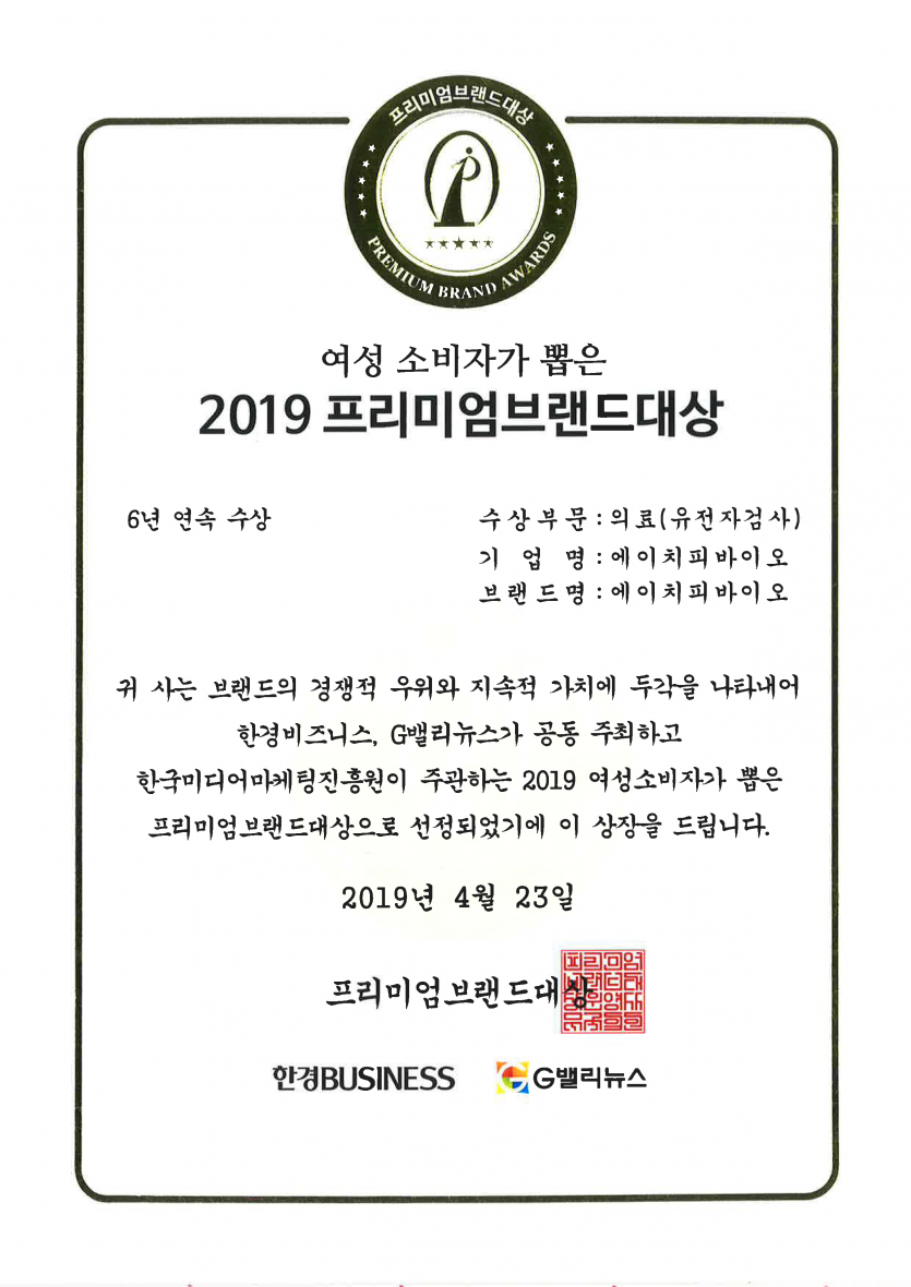 에이치피바이오가 4월 23일 ‘여성소비자가 뽑은 2019 프리미엄브랜드대상’에서 의료(유전자검사) 부문을 수상했다.
