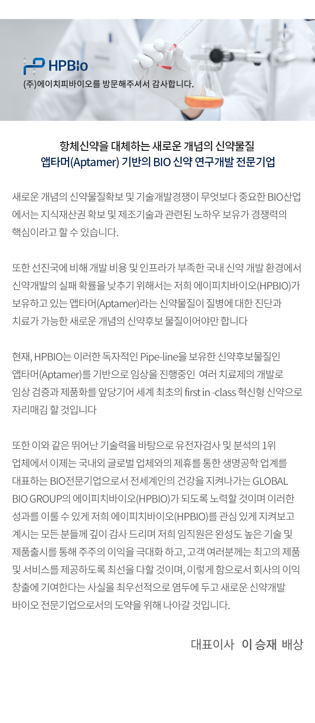 • (주)에이치피바이오 | 대표이사 : 이승재 | 개인정보취급최고책임자 : 이강봉